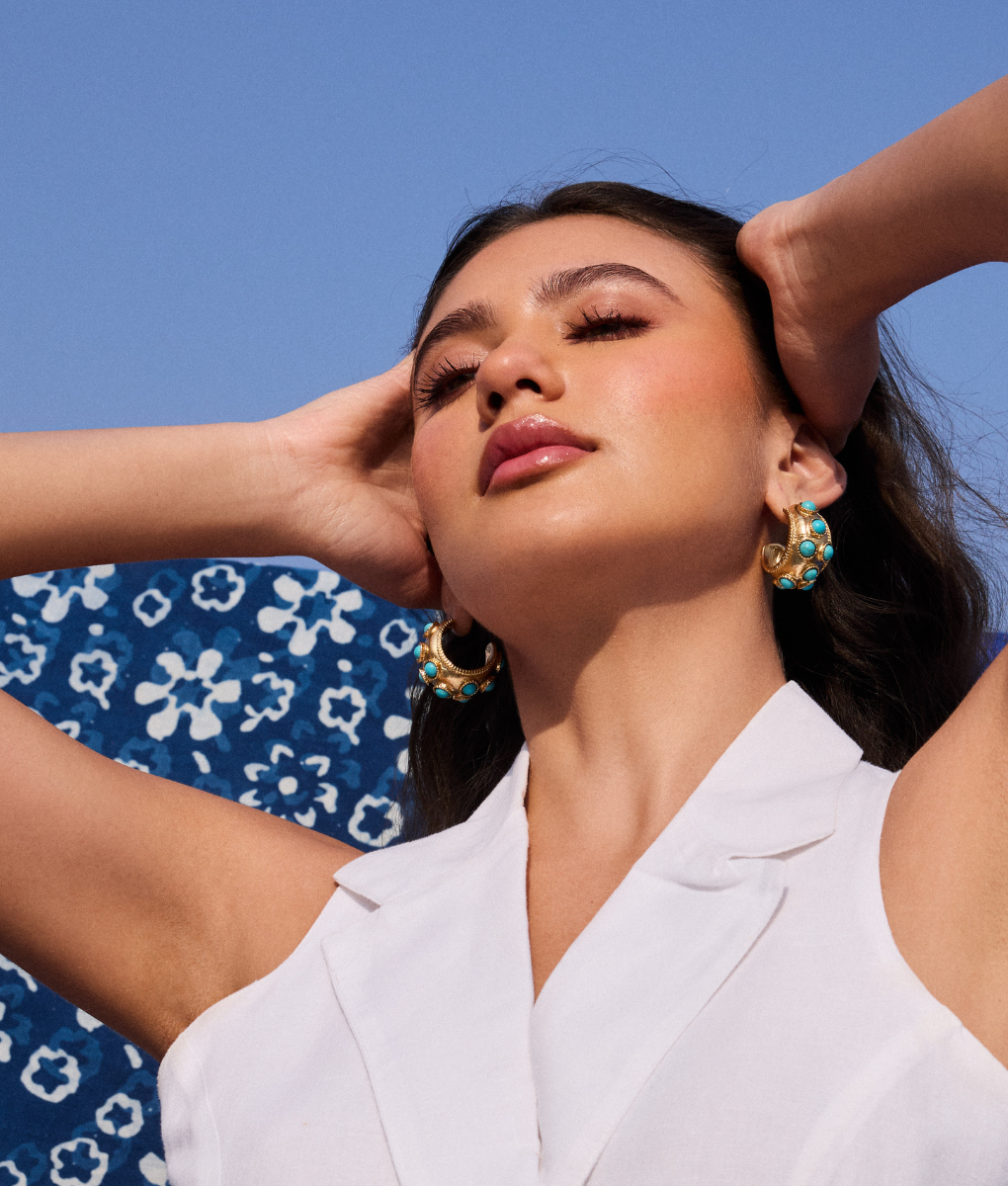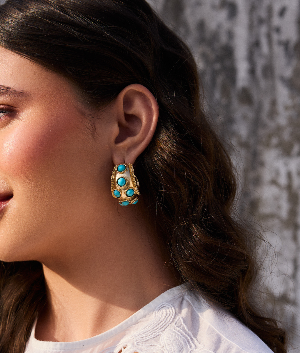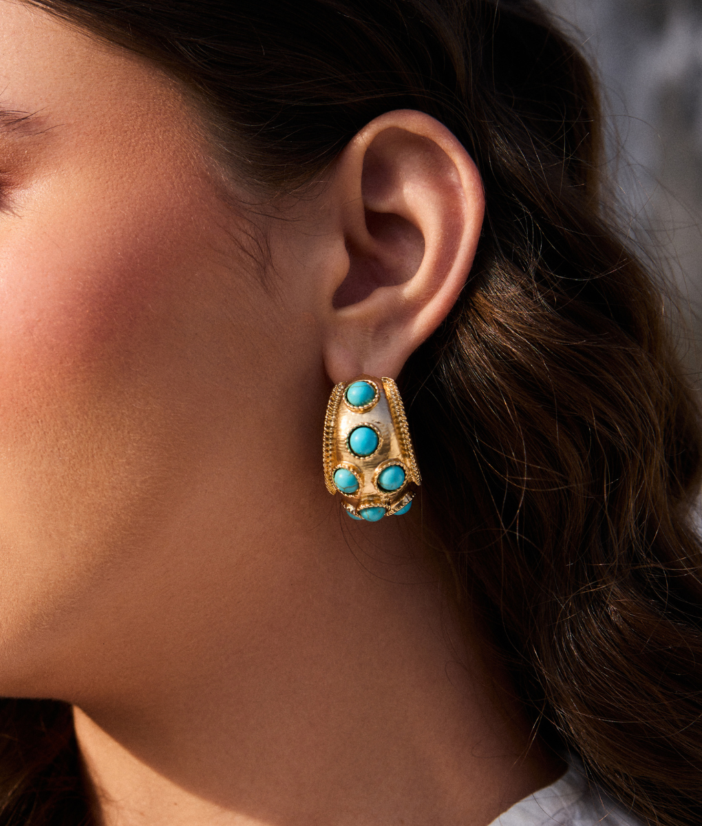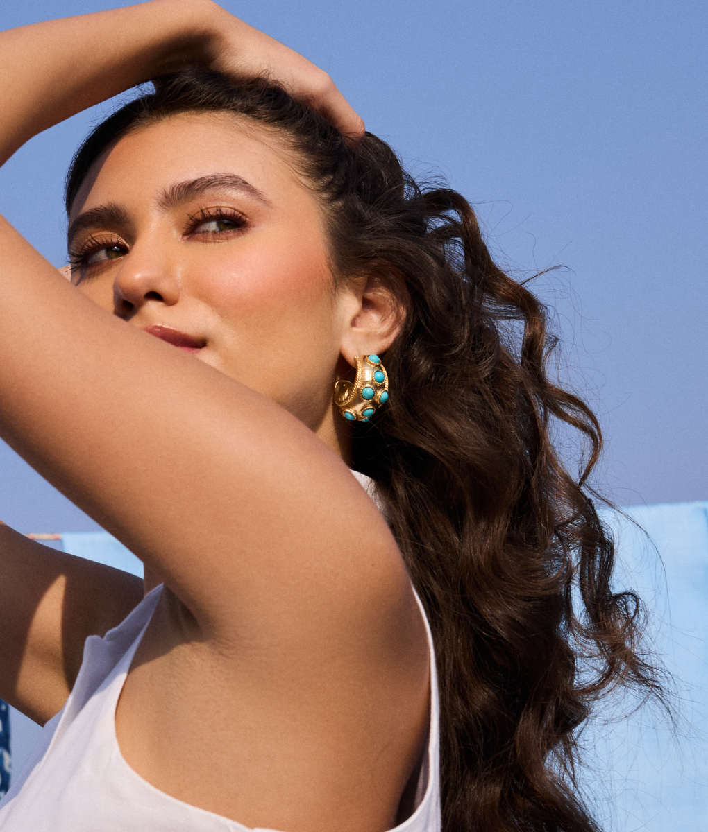 Make a refined statement with The Elanora Earrings, bold chunky hoops finished in luxurious 18k gold plating and adorned with natural turquoise stones. The substantial design commands attention while maintaining an air of understated elegance, perfect for those who appreciate statement jewellery with substance.