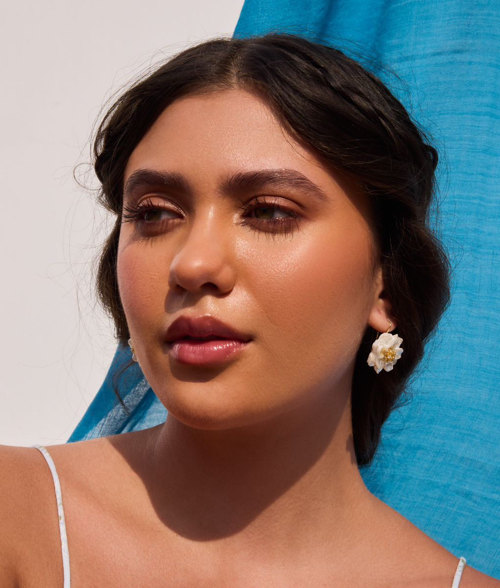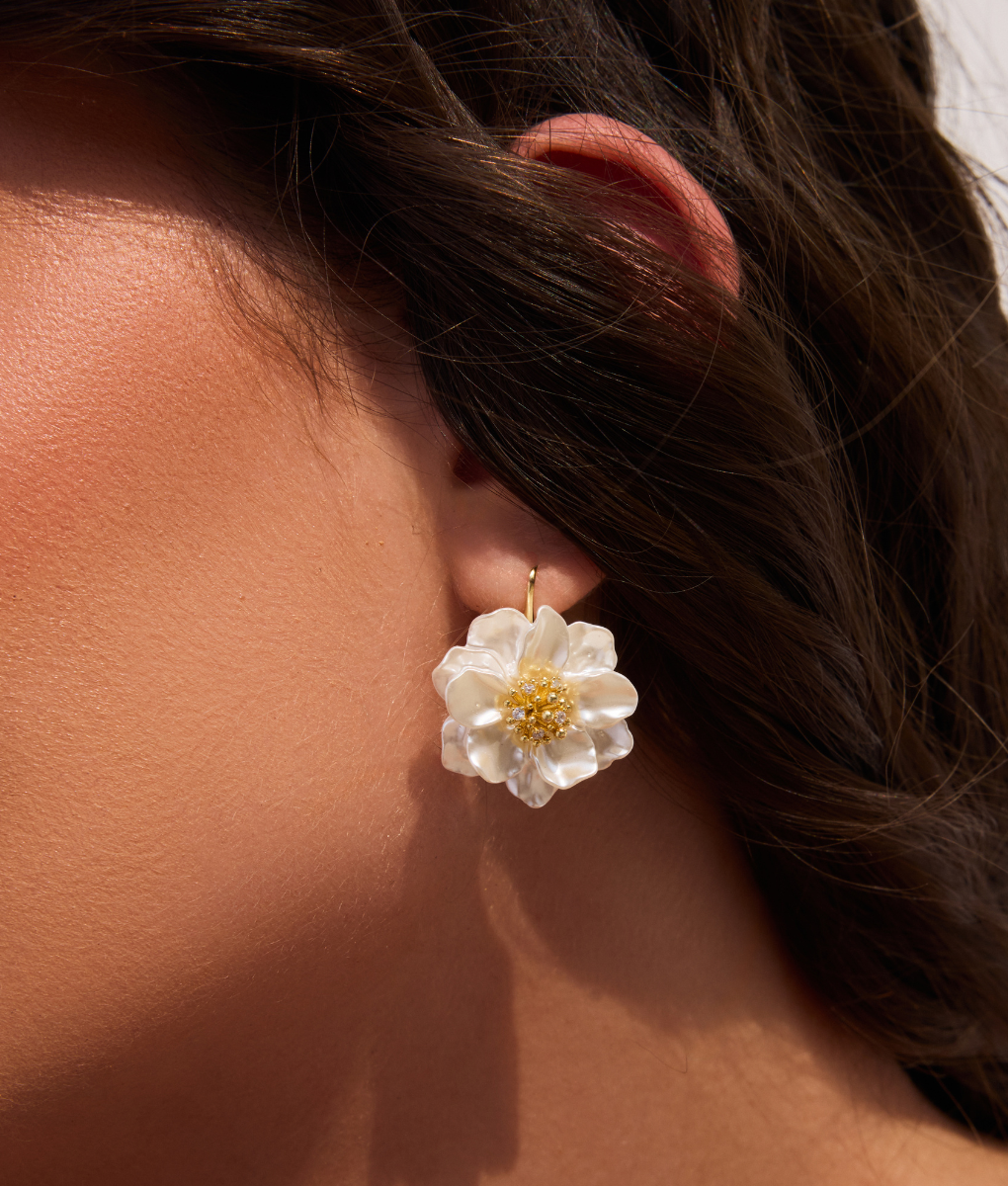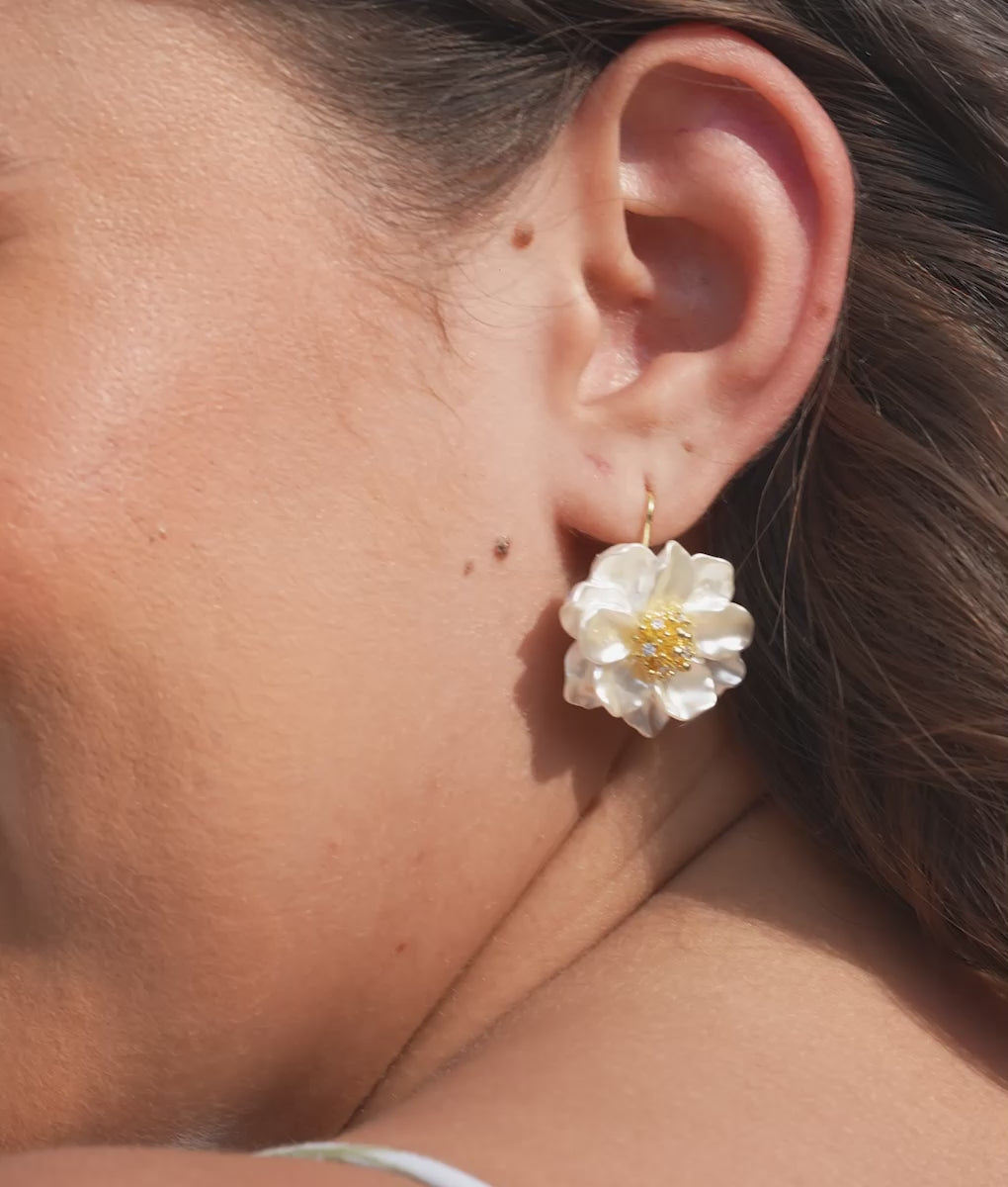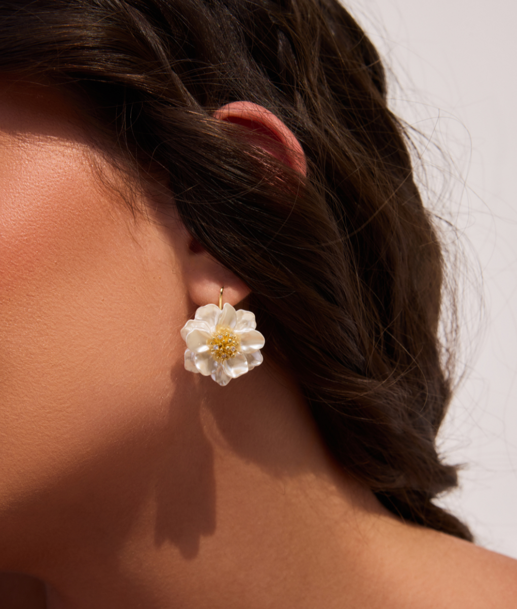 The Marelle Earrings combine lightweight acrylic petals with 18k gold-plated brass accents and sparkling cubic zirconia stones. This thoughtful material blend delivers both durability and luminosity.
