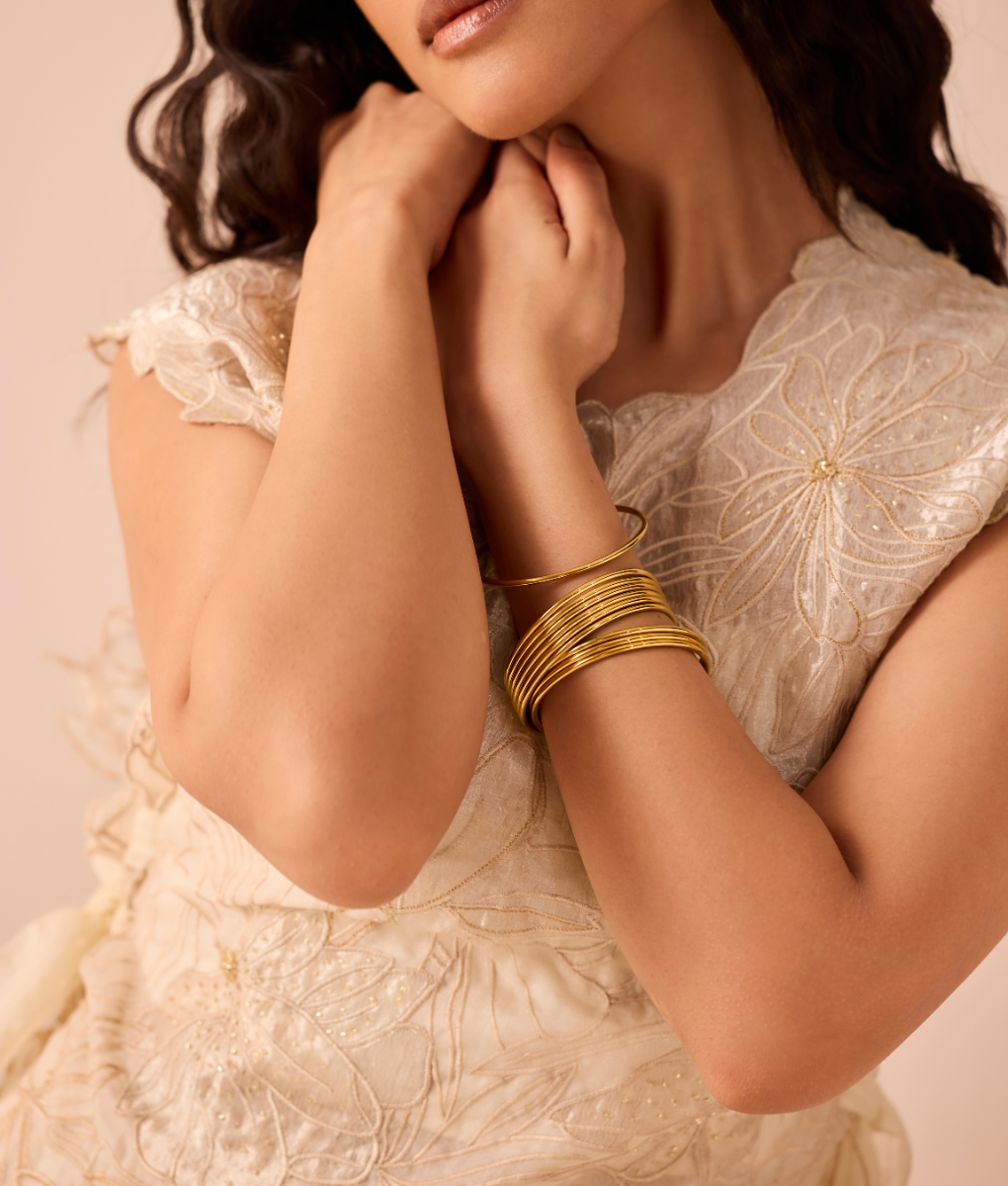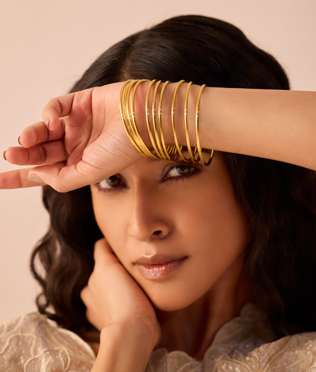 The Amna Bangle Stack has 5 delicately crafted bangles that shimmer with understated sophistication. This set offers versatile layering for any occasion, adding a refined touch to your ensemble while maintaining a light and graceful feel on the wrist. Perfect for those who appreciate subtle, timeless style.