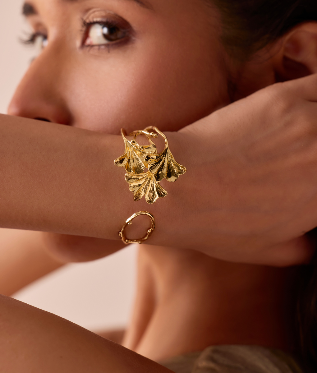 The Samiya Bangle showcases exquisite floral detailing on a sleek brass base, richly enhanced with an 18k gold plating. This elegant piece offers a refined touch of luxury, perfect for adding a subtle yet sophisticated accent to your jewellery collection.