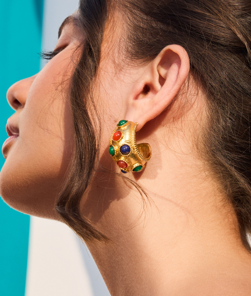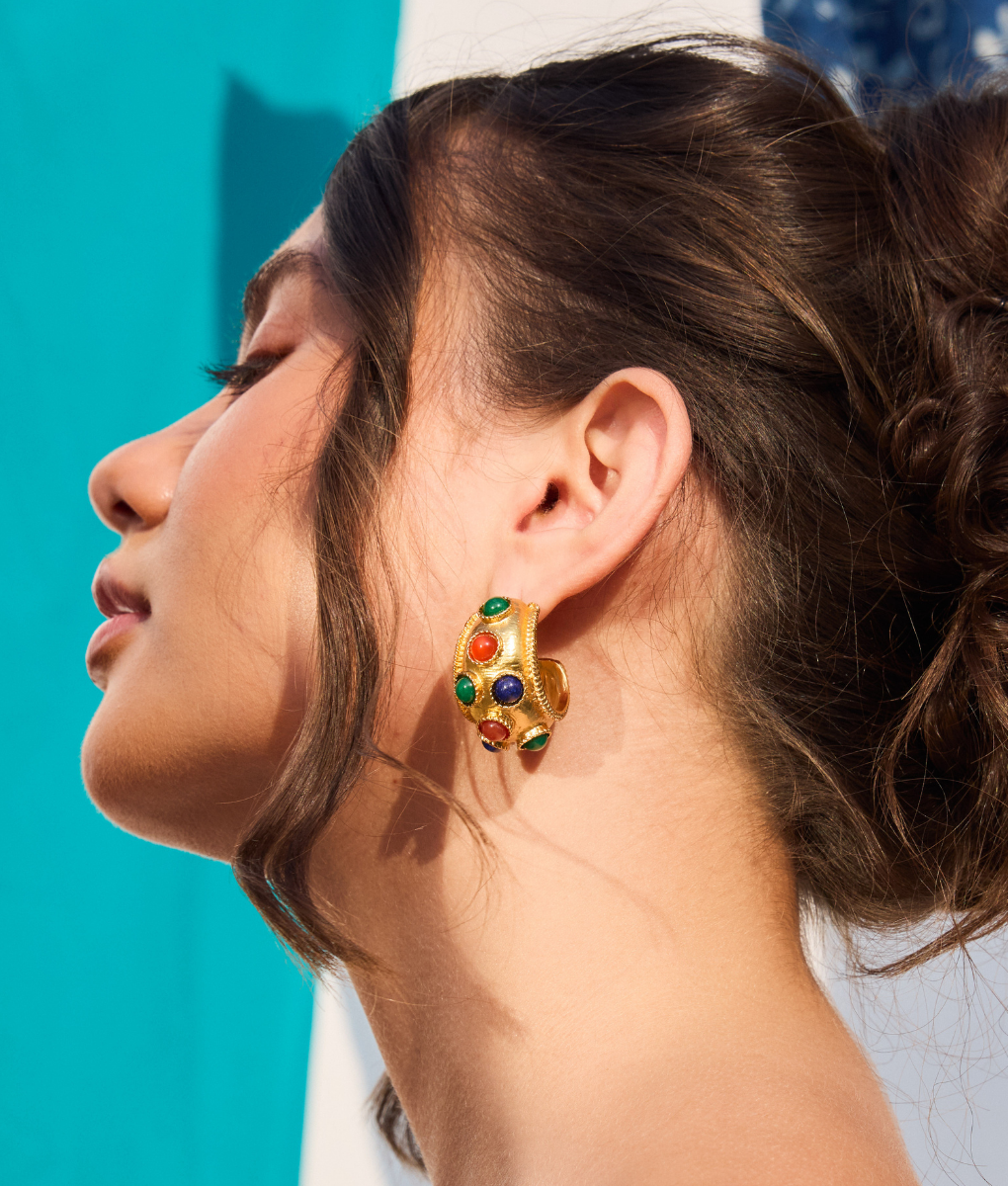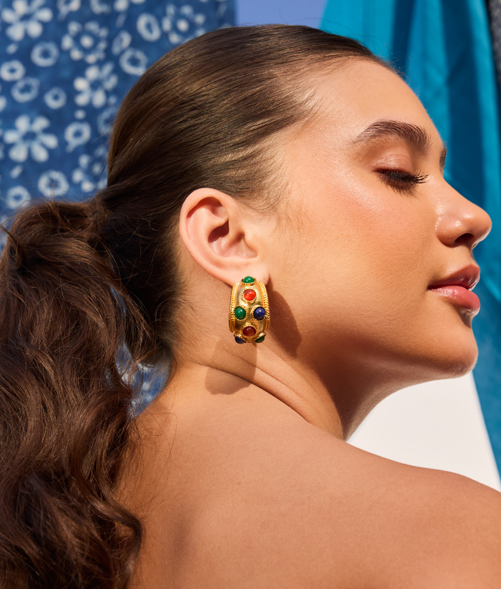Elevate your jewelry collection with The Lina Earrings, a sophisticated pair. 18k gold plated and adorned with vibrant multi-coloured natural stones. Each stone is carefully selected to create a harmonious blend of hues, making these earrings a versatile accessory for special occasions.