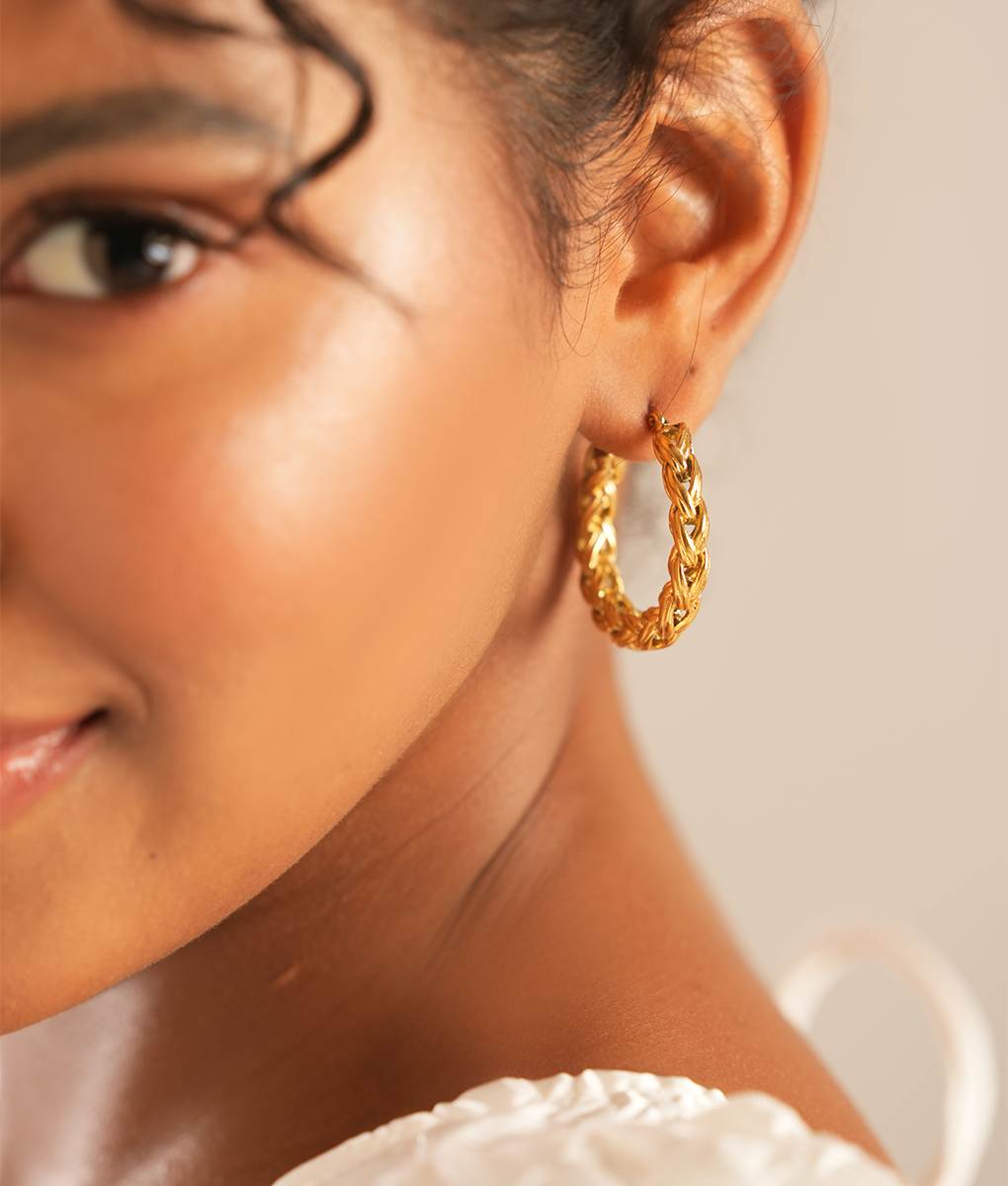 Expertly crafted with 18k gold plated stainless steel, the Moana Gold Hoops are a timeless addition to any jewellery collection. The intricate braided design adds a touch of elegance and durability, making these hoops the perfect choice for everyday wear. Elevate your style with these must-have statement pieces.