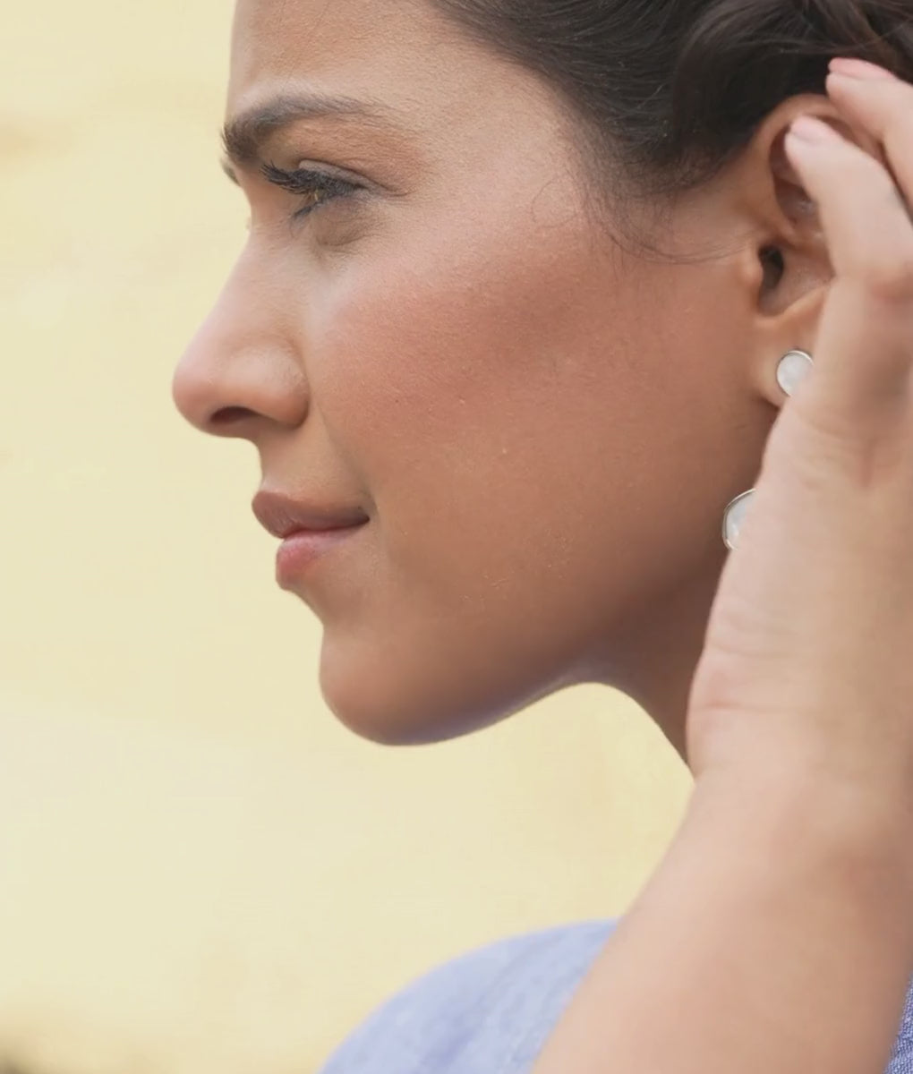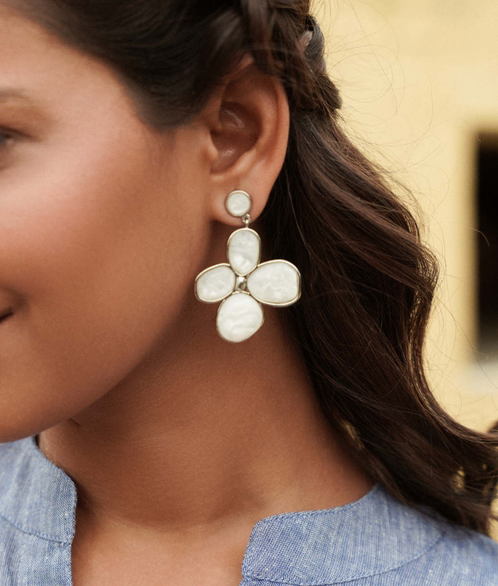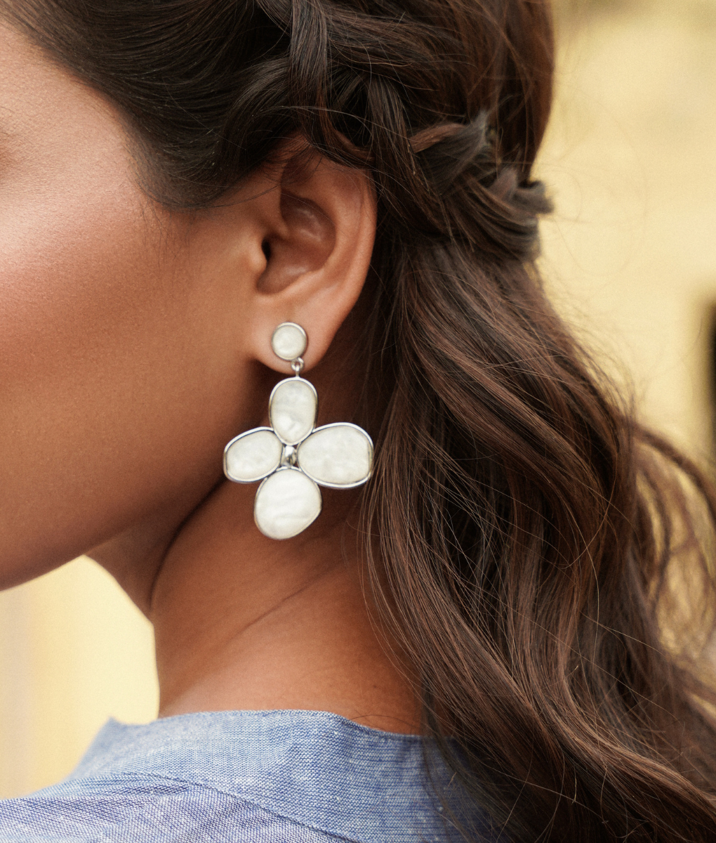 Flower-shaped earrings crafted from silver-plated brass. Each resin petal creates an elegant botanical design that catches the light beautifully. The lightweight construction ensures comfortable all-day wear, while the lustrous silver finish adds a timeless sophistication to any look. Perfect for everyday elegance or special occasions.