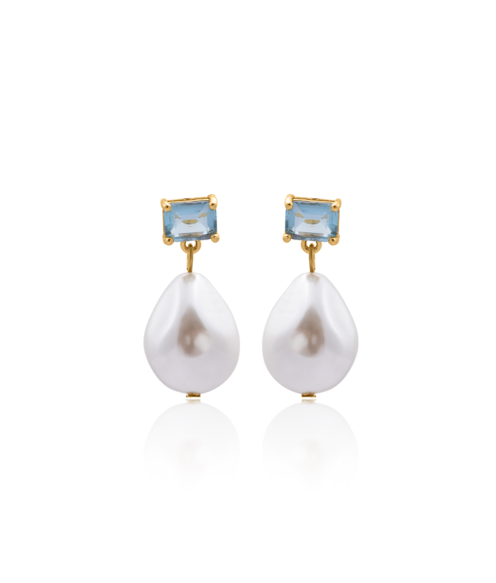 The Sirena Earrings bring together soft shimmer and structured elegance. Featuring a light blue cubic zirconia crystal paired with a luminous fresh water teardrop pearl, they strike a delicate balance between classic and contemporary. Perfect for golden hour moments, dinner dates, or any time you want just the right amount of glow.
